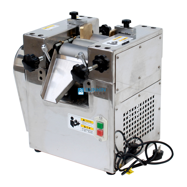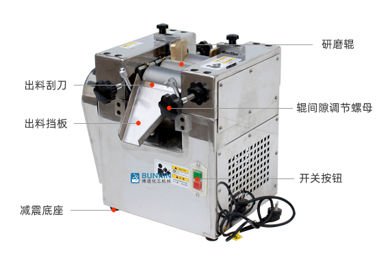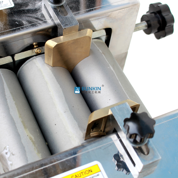 實驗室三輥研磨機由三個輥筒組成,裝在一個機架上,由電動機直接帶動。一般輥筒間的轉(zhuǎn)動方向不同,前輥向前轉(zhuǎn)動,中輥向后轉(zhuǎn)動。輥子轉(zhuǎn)速前輥快、后輥慢。中間輥固定,前后兩輥裝在滑道上,有彈簧裝置,用手輪調(diào)節(jié)前后輥與中輥的距離。物料由后輥與中輥之間進入,受到輥筒的擠壓,產(chǎn)品顆粒變細,然后由快輥帶出,快輥末端裝有刮刀,使物料與輥筒分離,落入收集桶內(nèi)。