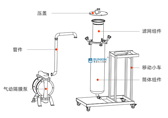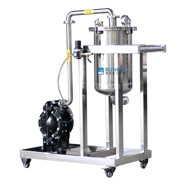 過(guò)濾小車包括了一個(gè)不銹鋼袋式過(guò)濾器、氣動(dòng)隔膜泵、氣源二聯(lián)件、單氣控閥,裝置在不銹鋼手推車上。氣動(dòng)隔膜泵將物料從拉缸或者罐體吸入至過(guò)濾器外殼的旁側(cè)入口管流入濾袋,過(guò)濾掉雜質(zhì)后的物料泵送至灌裝機(jī)進(jìn)行灌裝或者進(jìn)入儲(chǔ)罐儲(chǔ)存。袋式過(guò)濾器是一種壓力式過(guò)濾裝置,主要有過(guò)濾筒體、過(guò)濾筒蓋和快開(kāi)機(jī)構(gòu)、不銹鋼濾袋加強(qiáng)網(wǎng)等主要部件組成,濾液由過(guò)濾機(jī)外殼的旁側(cè)入口管流入濾袋,濾袋本身是裝置在加強(qiáng)網(wǎng)籃內(nèi),液體滲透過(guò)所需要細(xì)度等級(jí)的濾袋即能獲得合格的濾液,雜質(zhì)顆粒被濾袋攔截。不銹鋼移動(dòng)小車,帶萬(wàn)向腳輪,移動(dòng)方便。無(wú)電火花產(chǎn)生,符合防爆要求。