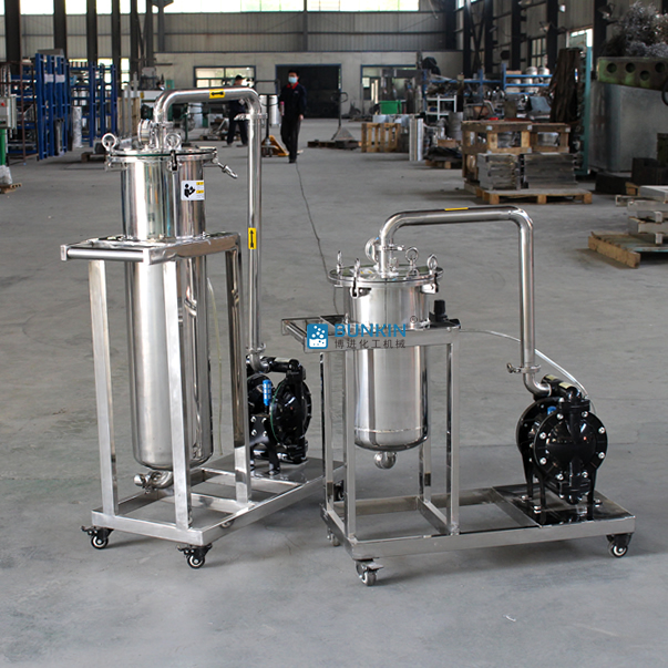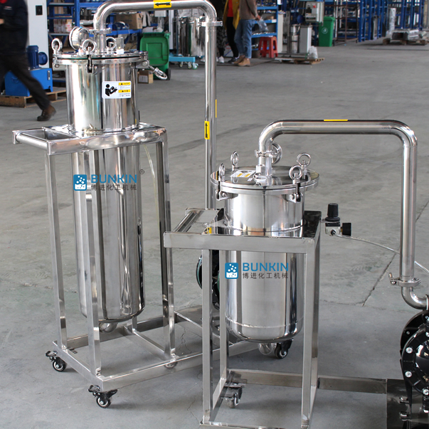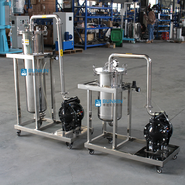 移動(dòng)式袋式過(guò)濾器包括了一個(gè)不銹鋼袋式過(guò)濾器、氣動(dòng)隔膜泵、氣源二聯(lián)件、單氣控閥,裝置在手推車上,可隨意移動(dòng)至任何生產(chǎn)線上進(jìn)行工作。袋式過(guò)濾系統(tǒng)是一種新型的過(guò)濾系統(tǒng),過(guò)濾機(jī)內(nèi)部由金屬網(wǎng)籃支撐濾袋,流體由入口流進(jìn),經(jīng)濾袋過(guò)濾后從出口流出,雜質(zhì)被攔截在濾袋中,更換濾袋后繼續(xù)使用。主要用于過(guò)濾產(chǎn)品的雜質(zhì),帶壓力監(jiān)測(cè)表,當(dāng)壓力過(guò)大提醒更換濾袋。