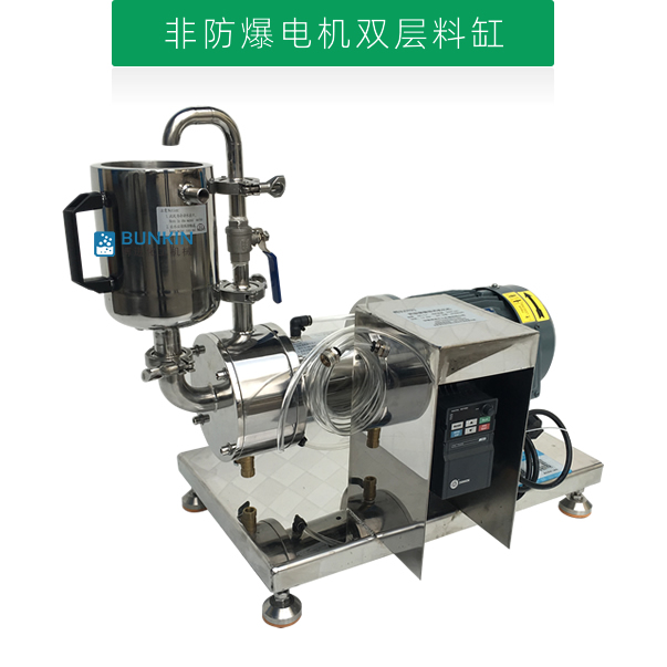實驗室乳化泵采用臥式結構;在狹長的工作腔內裝有一組或多組轉定子,轉定子對耦精密配合;由電機帶動中間軸進行高速運轉,轉定子形成真空,物料從雙層料桶進口被吸入轉定子腔內,強大動能使轉子產生極高的線速度,使物料在轉、定子間隙之間經過強烈的撞擊、破 碎、離心擠、液層摩擦、強力剪切之后泵送出去,物料從出口流出并進入單/雙層料桶循環(huán),從而使不相溶的固相、液相、氣相等多種介質在瞬間均勻精細、分散乳化,使產品達到穩(wěn)定的高品質產品。