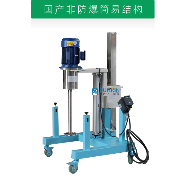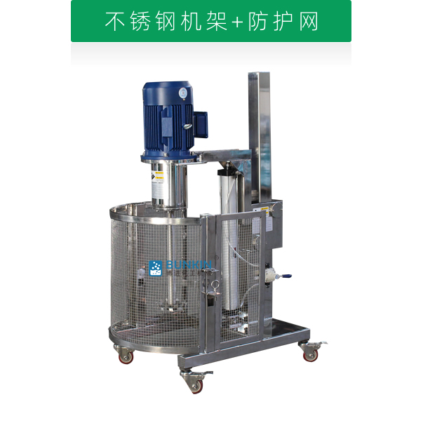 設(shè)備通過氣缸作為升降執(zhí)行器,帶氣動控制閥控制分散機上升、停止、下降,耗氣量低,操作簡單;分散盤采用內(nèi)六角螺栓與主軸固定,能夠方便快速拆卸更換,清洗容易;帶有手動夾桶裝置,可以快速將攪拌桶固定,防止桶在工作中發(fā)生位移造成安全事故;