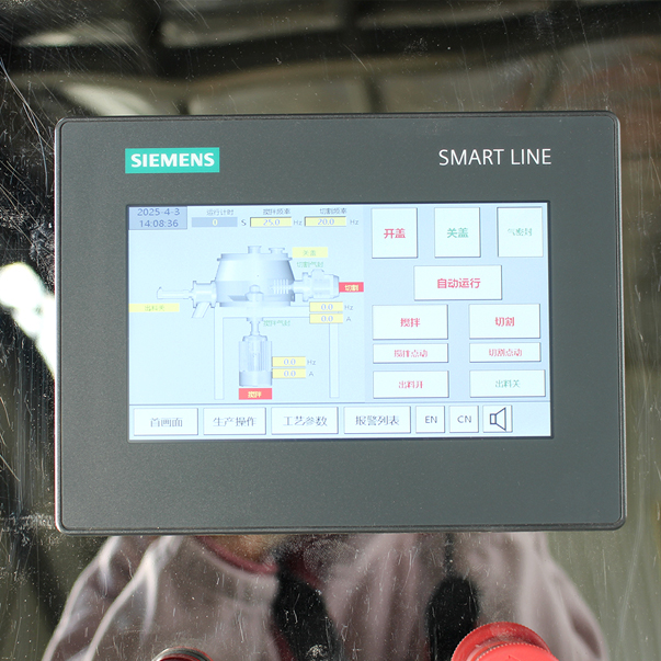 設(shè)備帶有智能化觸摸屏,?具有實(shí)時(shí)監(jiān)控與參數(shù)顯示等功能,支持一鍵啟停、參數(shù)調(diào)整(如開(kāi)蓋、轉(zhuǎn)速、出料等)