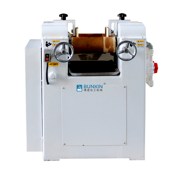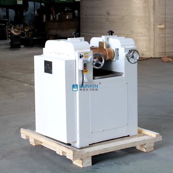 三輥研磨機由三個輥筒組成,裝在一個機架上,由電動機直接帶動。一般輥筒間的轉(zhuǎn)動方向不同,前輥向前轉(zhuǎn)動,中輥向后轉(zhuǎn)動。輥子轉(zhuǎn)速前輥快、后輥慢。中間輥固定,前后兩輥裝在滑道上,有彈簧裝置,用手輪調(diào)節(jié)前后輥與中輥的距離。物料由后輥與中輥之間進入,受到輥筒的擠壓,產(chǎn)品顆粒變細,然后由快輥帶出,快輥末端裝有刮刀,使物料與輥筒分離,落入收集桶內(nèi)。