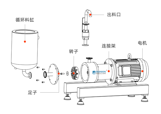 實驗室乳化泵采用臥式結構;在狹長的工作腔內裝有一組或多組轉定子,轉定子對耦精密配合;由電機帶動中間軸進行高速運轉,轉定子形成真空,物料從雙層料桶進口被吸入轉定子腔內,強大動能使轉子產生極高的線速度,使物料在轉、定子間隙之間經過強烈的撞擊、破 碎、離心擠、液層摩擦、強力剪切之后泵送出去,物料從出口流出并進入單/雙層料桶循環(huán),從而使不相溶的固相、液相、氣相等多種介質在瞬間均勻精細、分散乳化,使產品達到穩(wěn)定的高品質產品。