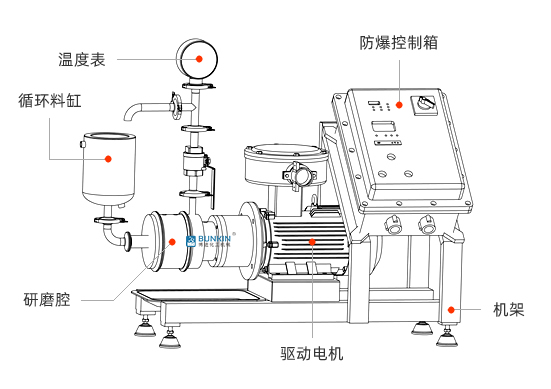 所配料桶及研磨腔體帶冷卻水夾套,在設(shè)備運(yùn)行時(shí)通水冷卻,起到很好的冷卻效果,常規(guī)溫升小于10º。