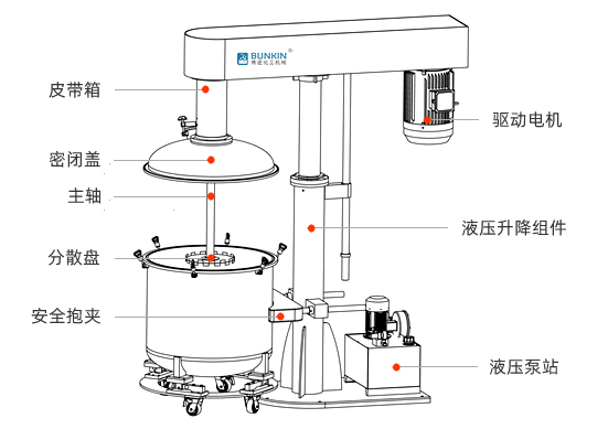 設(shè)備通過油缸作為升降執(zhí)行器,帶控制閥控制分散機上升、停止、下降,操作簡單,穩(wěn)定性高;分散盤采用內(nèi)六角螺栓與主軸固定,能夠方便快速拆卸更換,清洗容易,且可以根據(jù)工藝情況更換不同的分散盤,實現(xiàn)分散效果;帶有不同的抱夾方式(皮帶、手搖、氣動),可以快速將攪拌桶固定,防止桶在工作中發(fā)生位移造成安全事故。